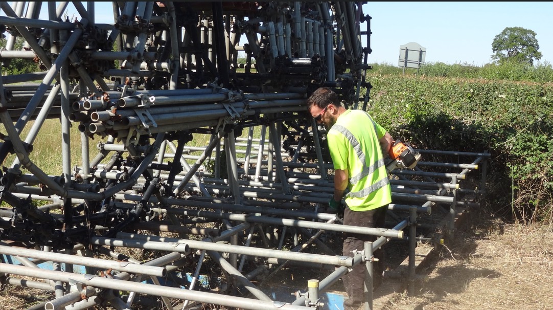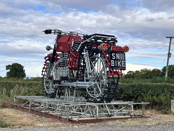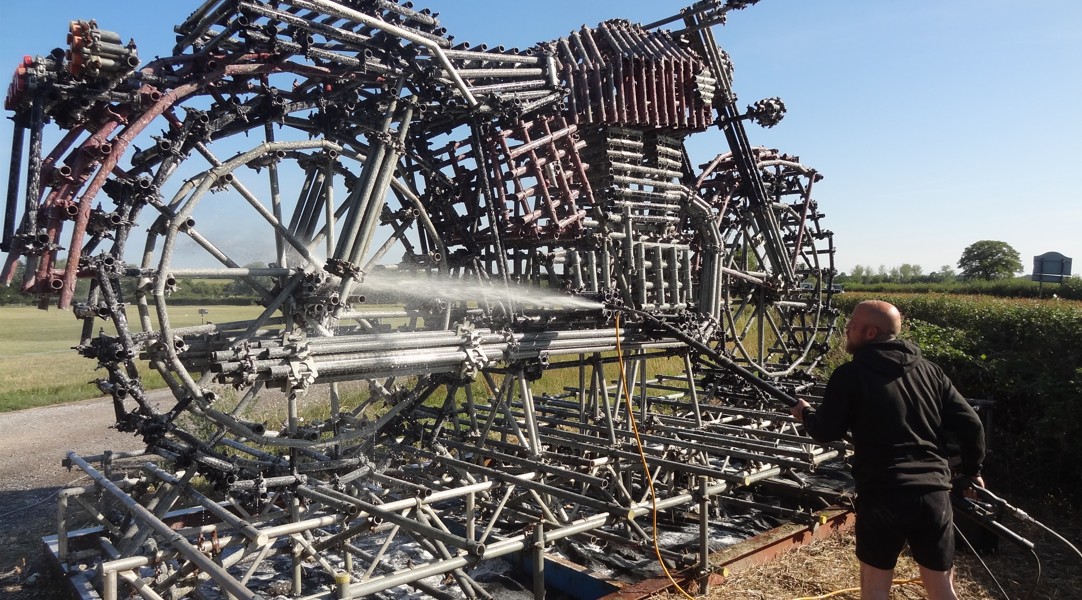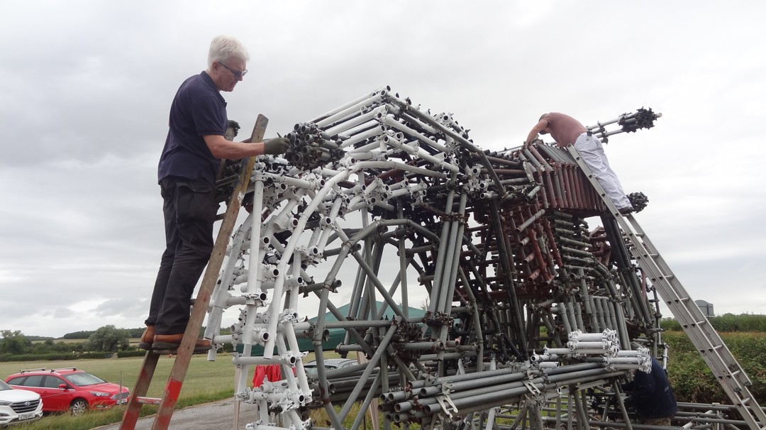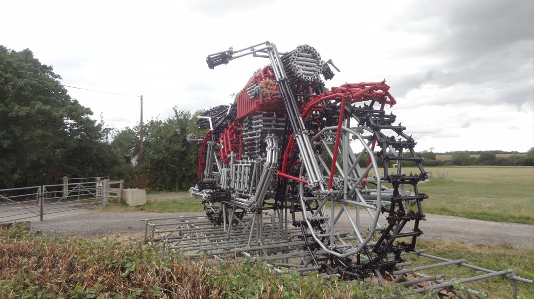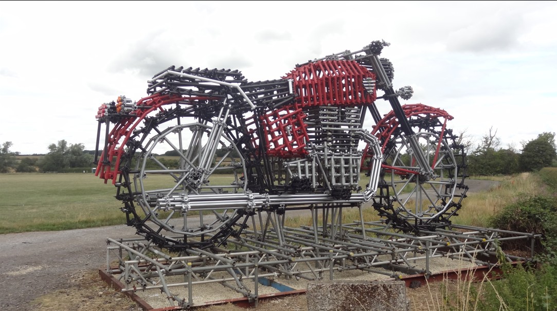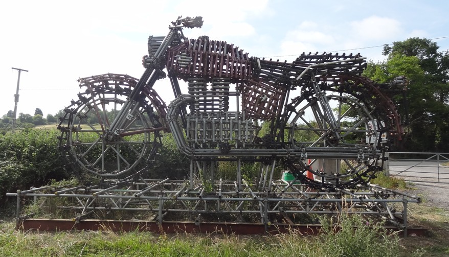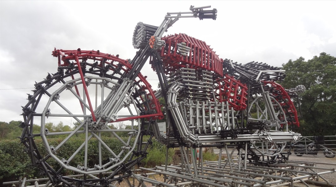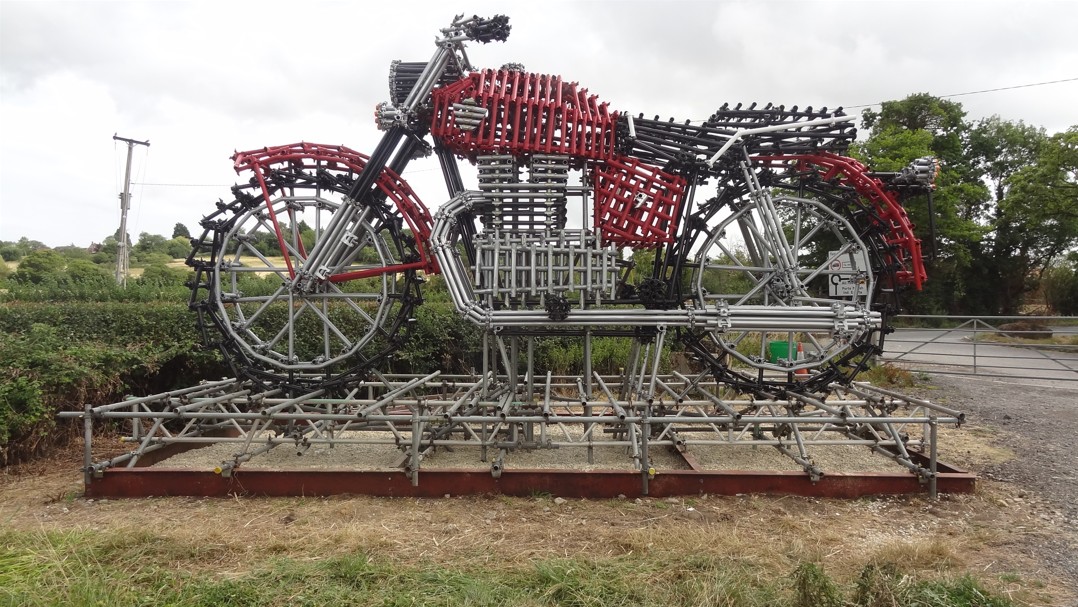 We’ve all ridden or driven past the “Scaffold Bike,” the large motorcycle sculpture made from scaffolding pipes, which is located at the entrance to Beversbrook Farm on the A3102 towards Hilmarton, just outside Calne. It was built by Toby Welsby (pictured below) back in 2013 and stands approximately 20 feet high. The sculpture was created to commemorate the Calne Bike Meet, our very own annual and free motorcycle event.
