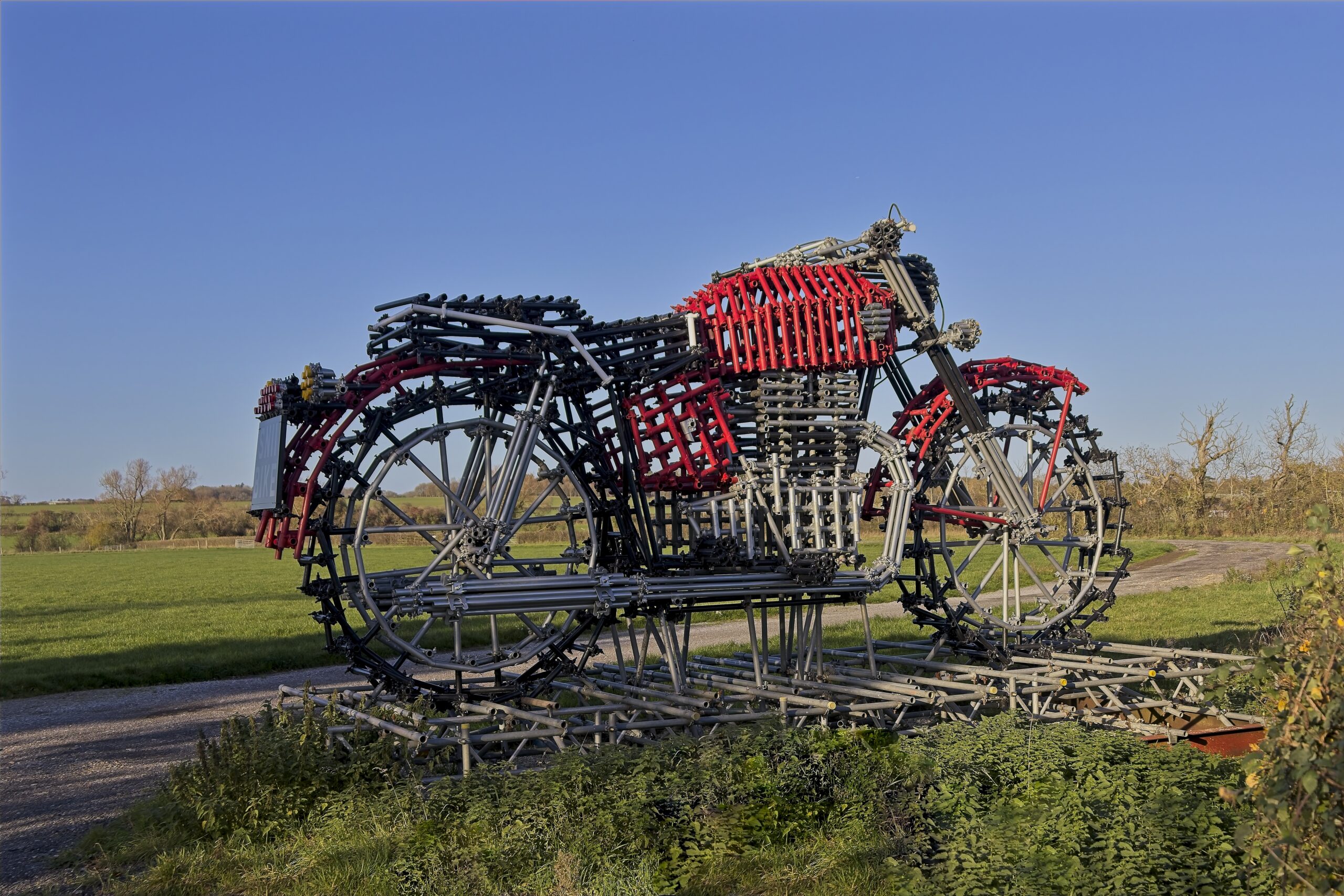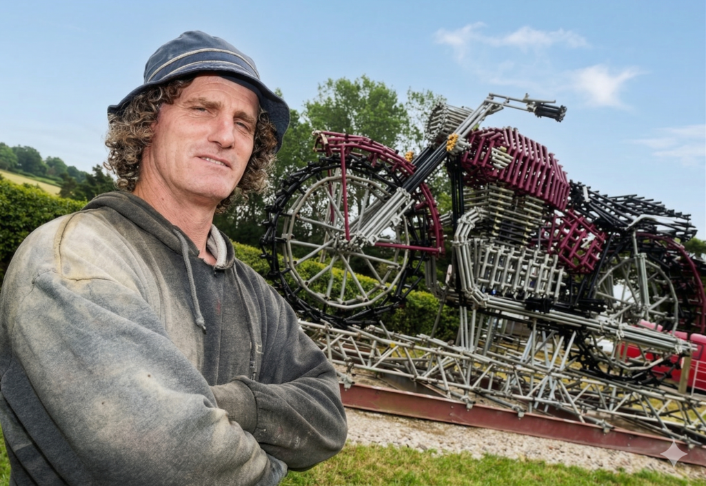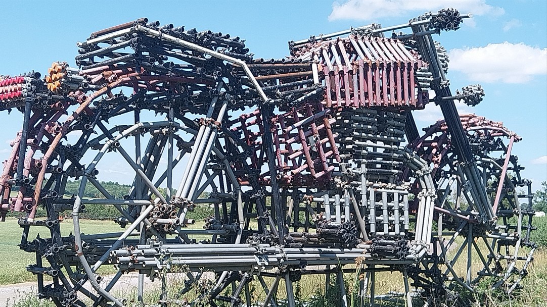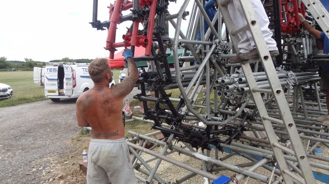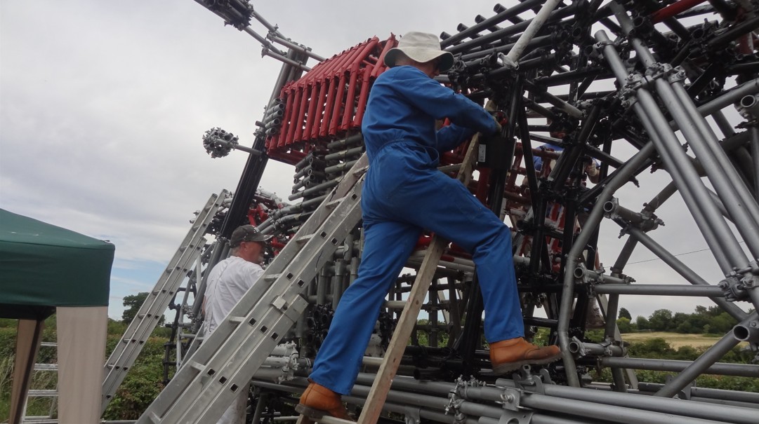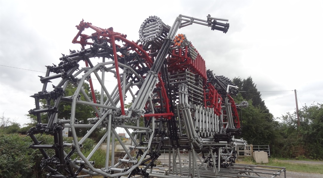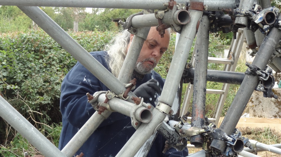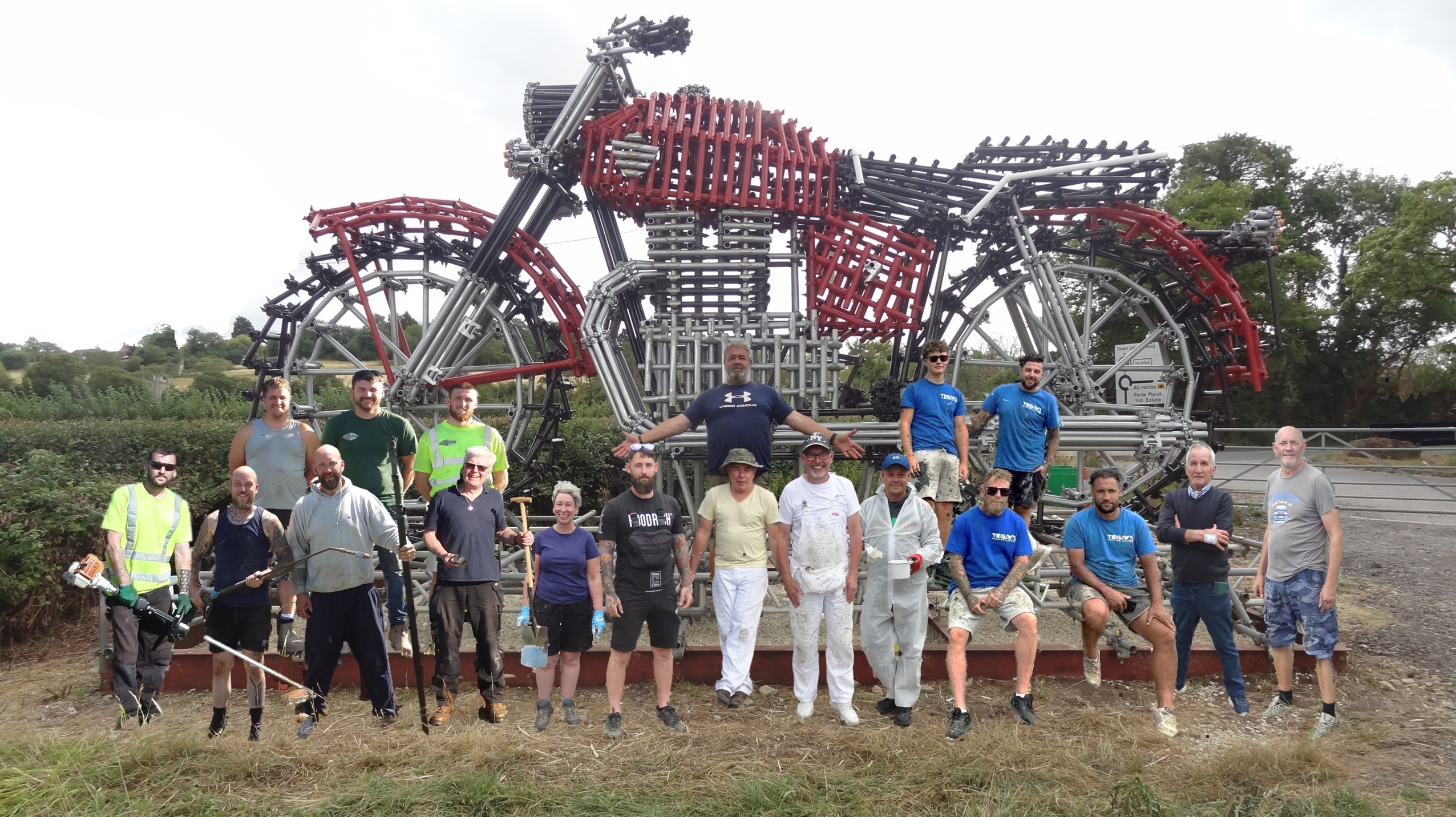 We’ve all ridden or driven past the “Scaffold Bike,” the large motorcycle sculpture made from scaffolding pipes, which is located at the entrance to Beversbrook Farm on the A3102 towards Hilmarton, just outside Calne. It was built by Toby Welsby (pictured below) back in 2013 and stands approximately 20 feet high. The sculpture was created to commemorate the Calne Bike Meet, our very own annual and free motorcycle event.