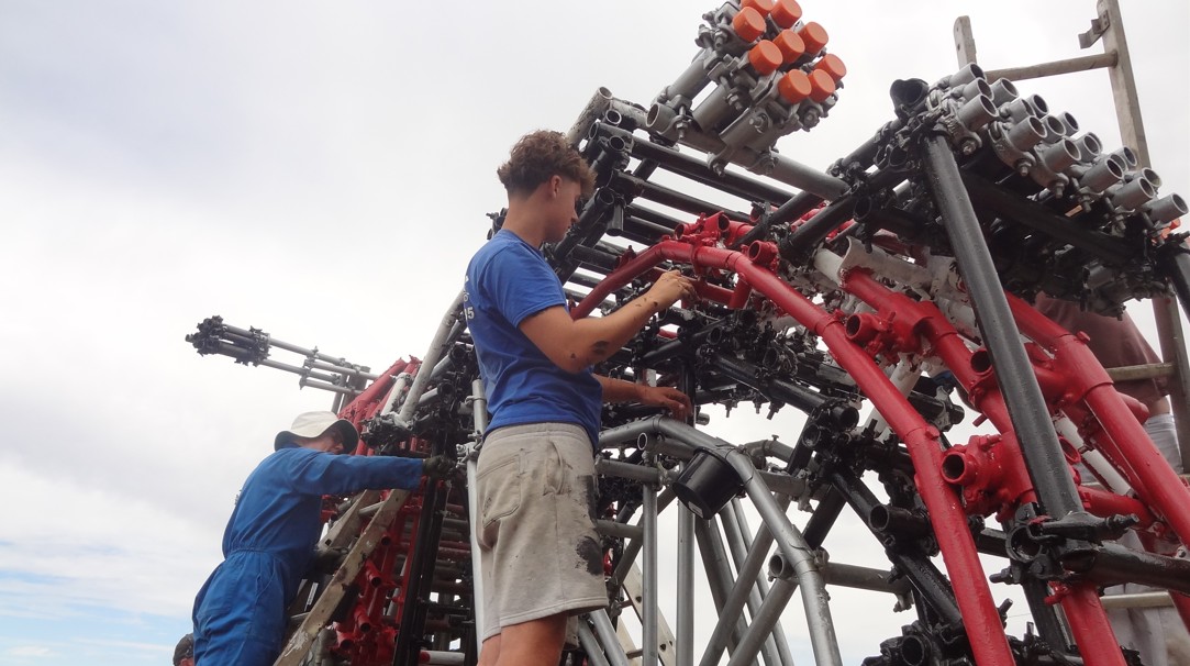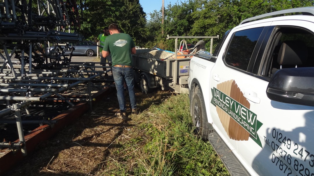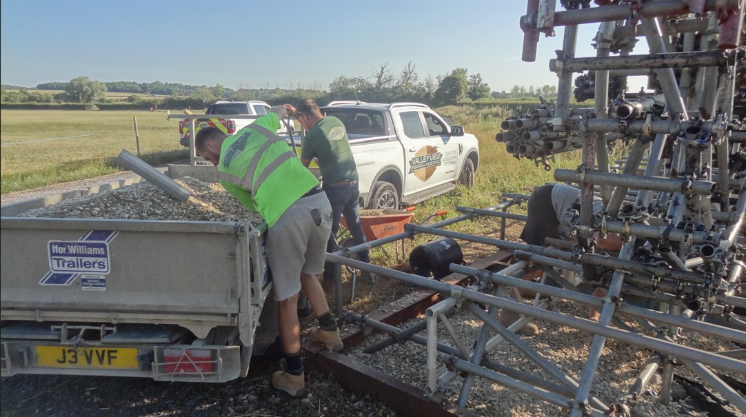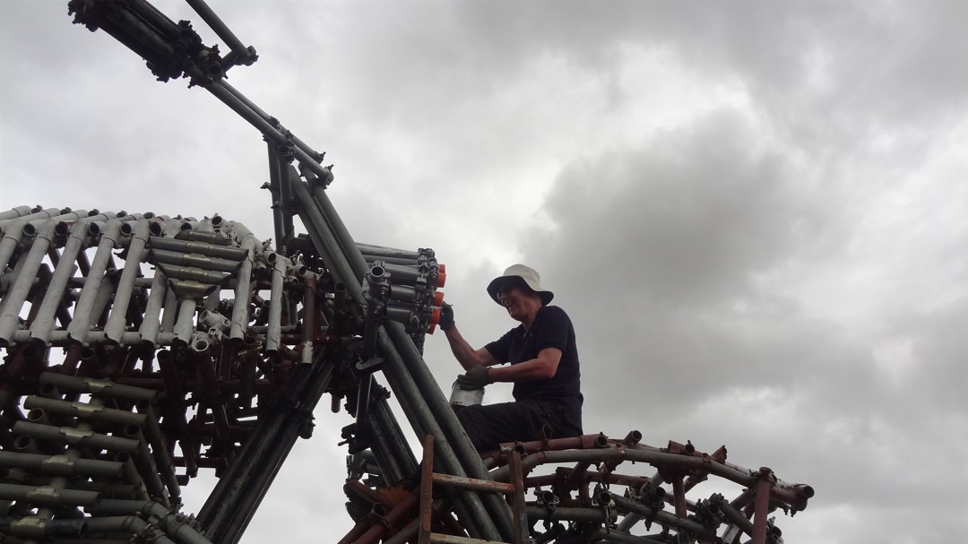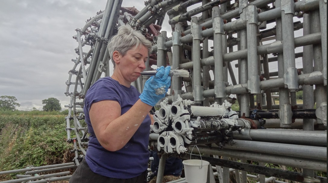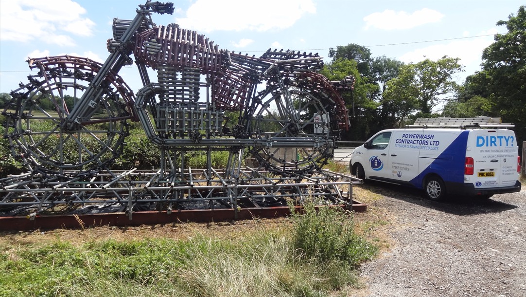 Permission was granted from the sculptor and landowner, and we set to work strimming the base area, high-power jet washed away all the old flaky and faded paint. We laid new membrane with tons of gravel, tightened a few nuts and bolts here and there before giving her a full coat of primer.